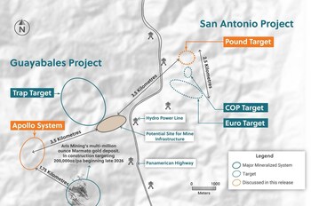 Figure 4: Plan View of the San Antonio and Guayabales Projects Highlighting the Pound Target and the Apollo System (CNW Group/Collective Mining Ltd.)