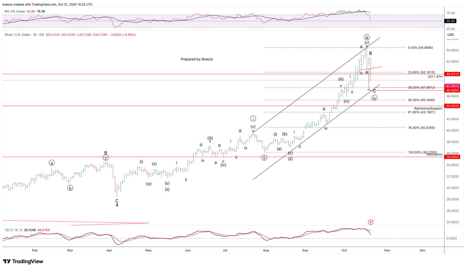 Spot Silver Wave Count Update. Minute Wave (circle) iii is complete and Minute Wave (circle) iv is in play and typically retraces to the 38.2% level. H&S top projects a target of ~47. Note: I relabeled the count from the April Low. Breeze