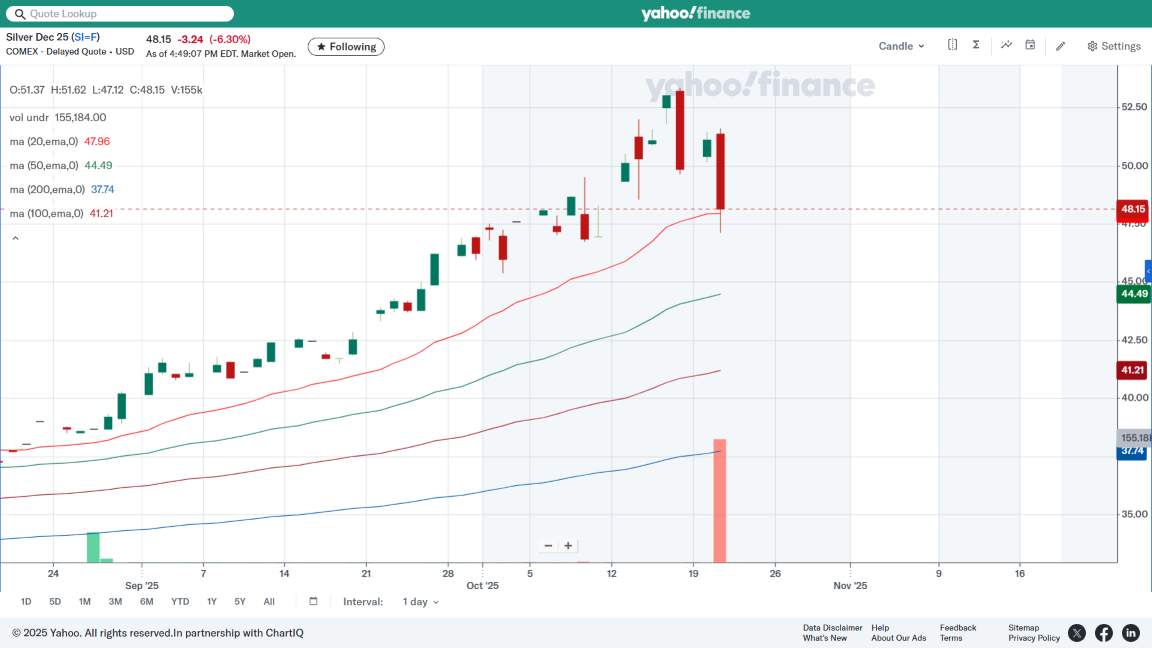 I think this is perhaps gold's largest sell off to date. The bearish engulfing is one of the largest red candle sticks I've ever seen, especially on such high volume, it gave back 5.12% $223.00, could this be a new norm for metal corrections? The 20-day-ema at $4,015. could be a target if buyers don't step in.