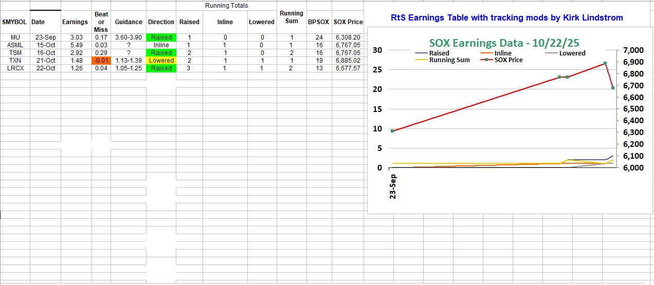 SOX Components Earnings' Table Update - LRCX Beats and Raises with an after hours Gain of almost everything the stock lost earlier today:
