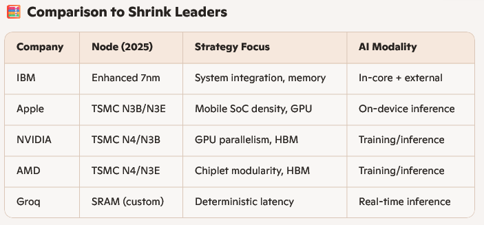 | Yes—IBM appears strategically comfortable operating a node or two behind the leading-edge shrink curve, prioritizing system-level performance, memory bandwidth, and AI integration over raw transistor density.