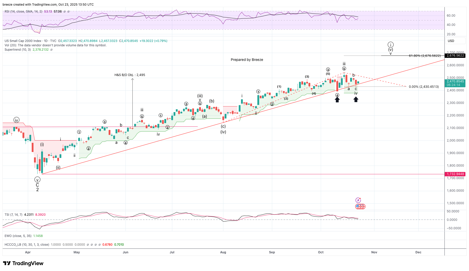 RUT Wave Count Update on a candlestick chart. I snapped an ascending trend line off the April low. Note the false break in early October and again yesterday but a close above it. If Wave iv is complete, then Wave v is in play with a target of 2,676. Note the obj for that H&S continuation formation was achieved. Breeze