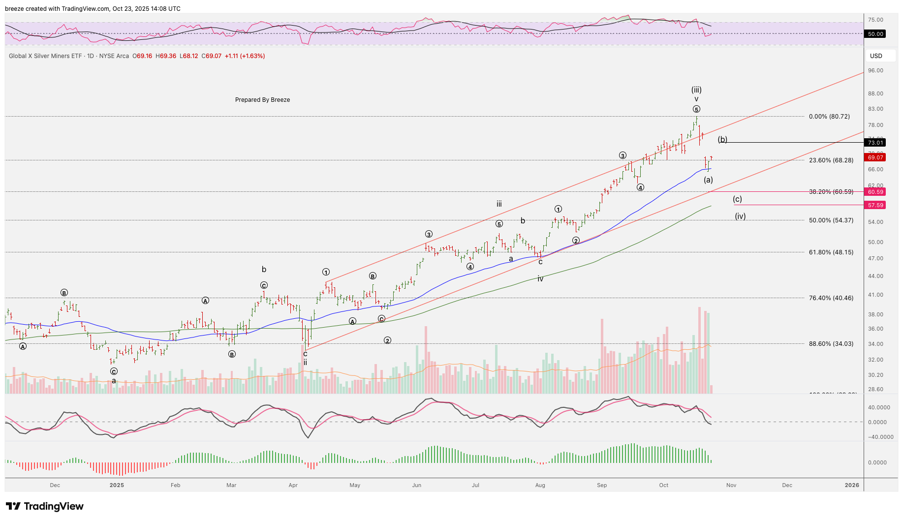 SIL Wave Count Update. Wave (iv) has unfolded as an abc decline with a target range of 60 - 57. Wave (a) is complete and Wave (b) is in play and typically retraces 50% of Wave (a) decline. Breeze