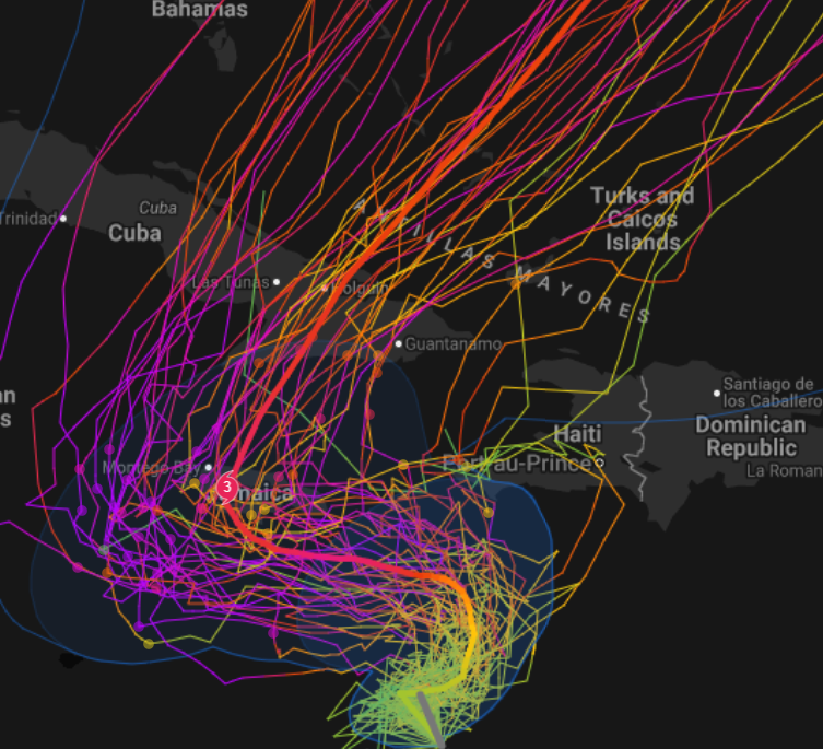 Google DeepMind AI never shows it surpassing Category 3, so this could be a good test of its accuracy in predicting storm strength over the long term. as of 12PM 23 Oct 2025 Jamaica and the U.S. military facilities at Gitmo will be hit hard.