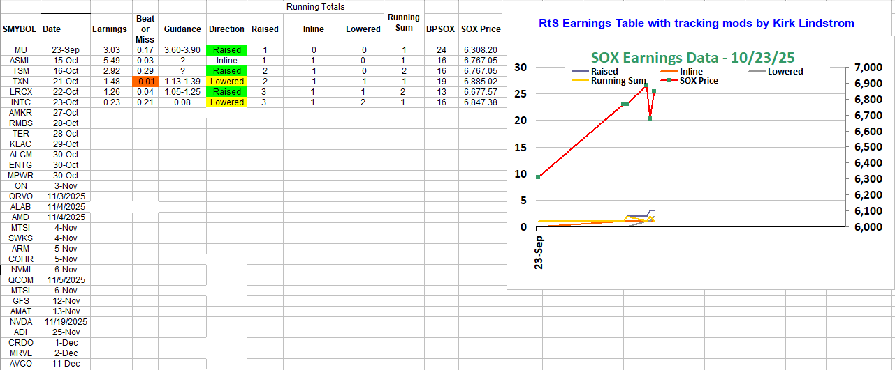 SOX Components Earnings' Table Update - Now Including INTC's Beat but typical lowered guidance leading to an Actual Gain in the stock after hours. Better than feared my friends! Table below: