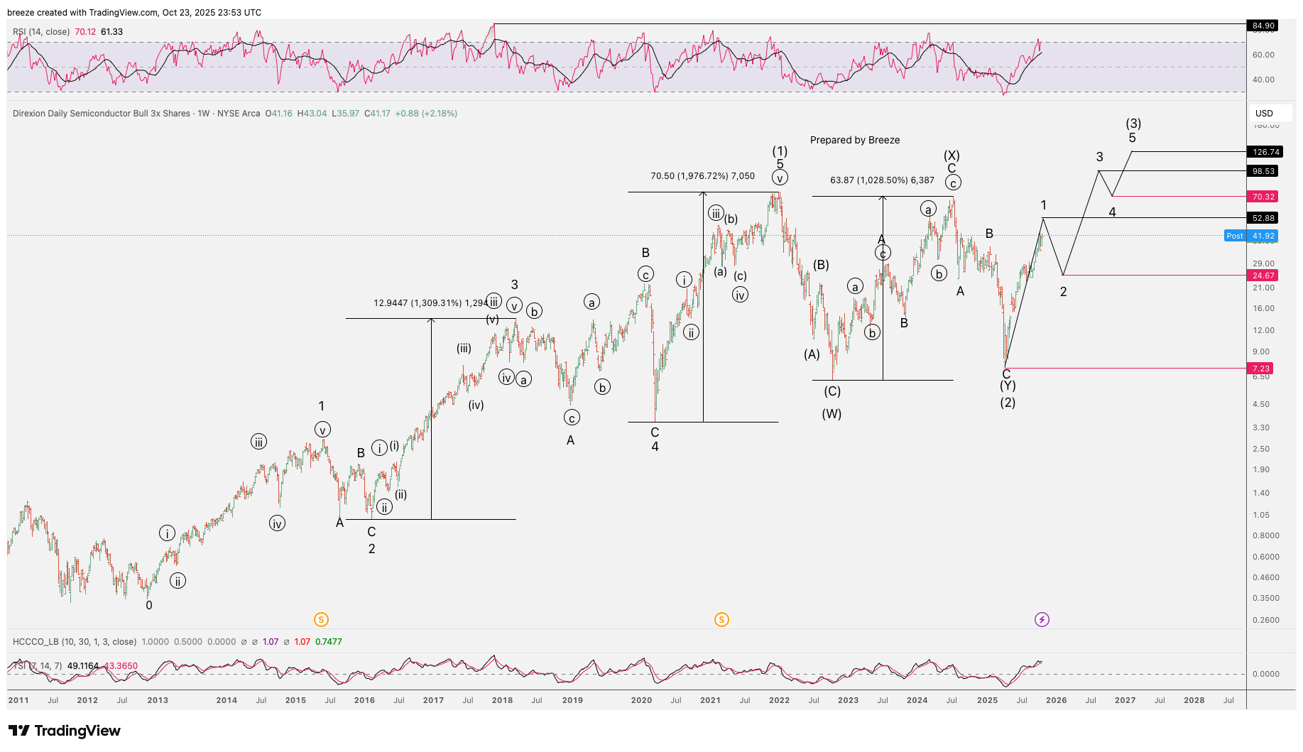 SOXL Update. On 7/7/25 I posted the result of my EW Model that projected the five Minor Waves to reach Intermediate Wave (3)'s target of 126.74. Here's an update. My EW Model Projected Minor Wave 1's target at 52.88 the high thus far is 43.37. 9.51 to go. Breeze