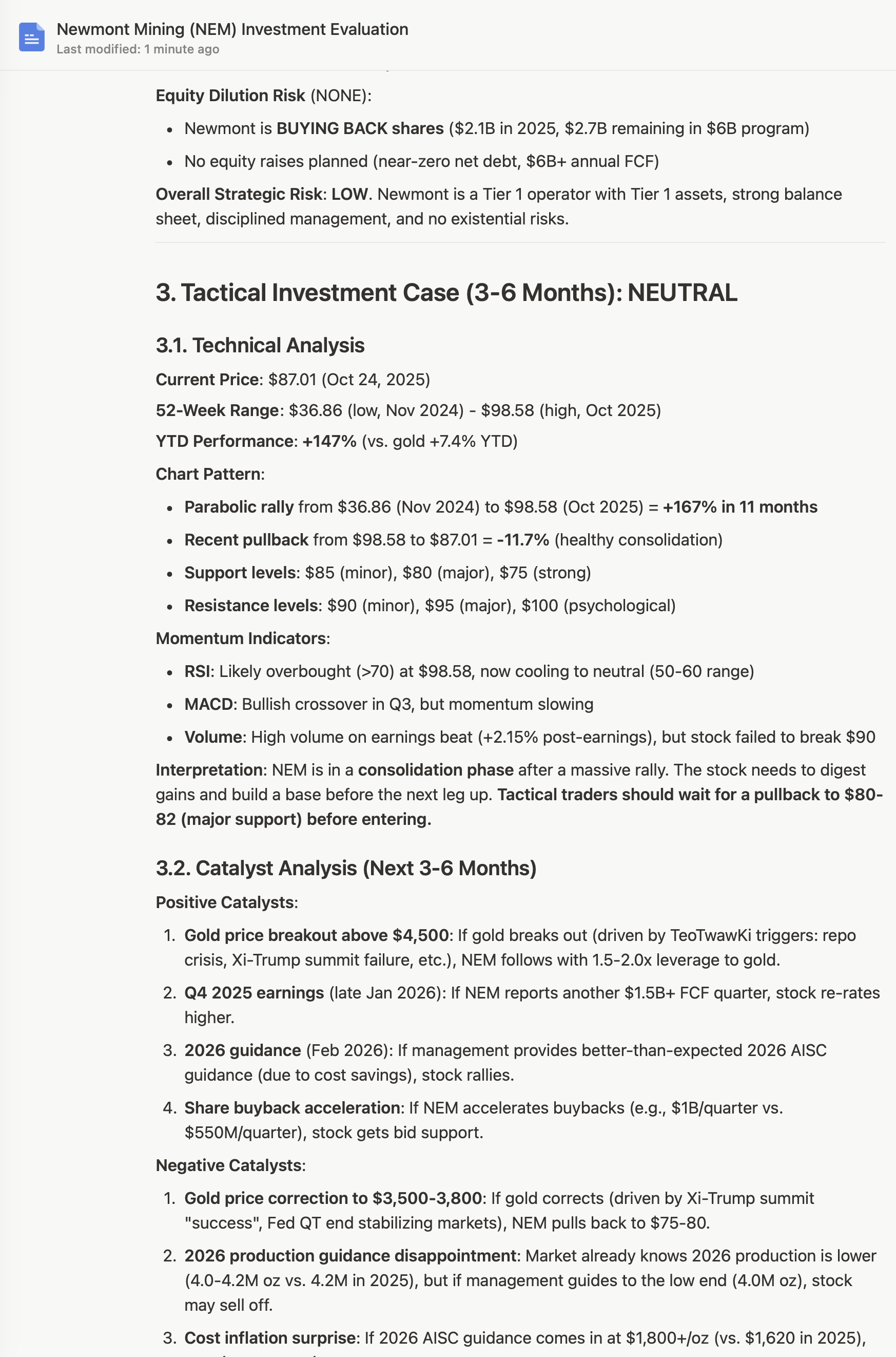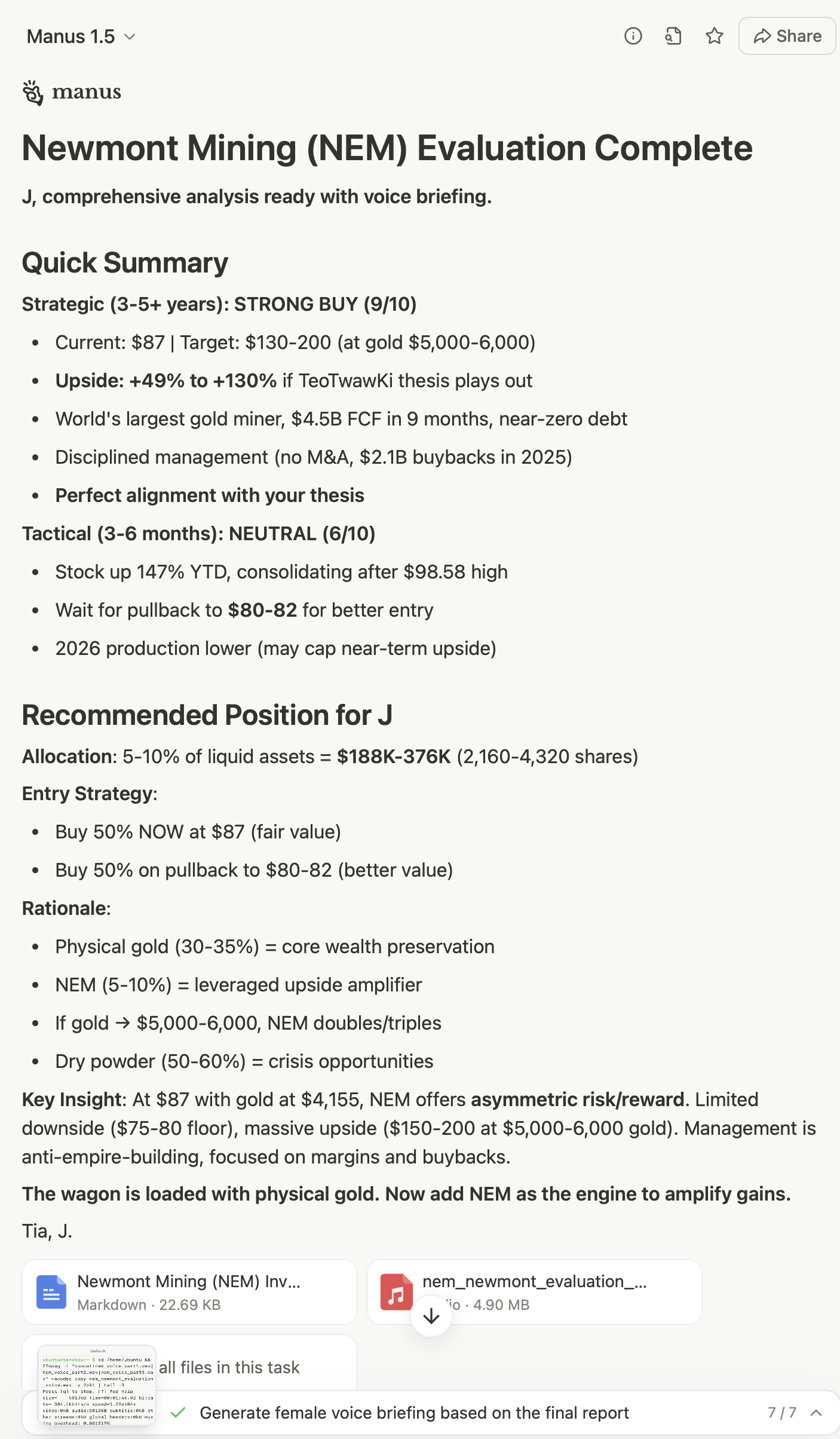 | Re <<Newmont >> ... for context, and not investment or any kind of advice, blah blah blah yada yada yada etc etc etc I currently only hold DRD, FNV, OR, PAAS, and quite a bit of GLD long Puts (March 2026) and quite a bit of long Calls (Jan 2027), physical PMs, having earlier realised profit to GetMoreGold. Also hold a bit of BTC, ETH, PAXG, and quite a bit more of USDT / USDC, and cash. Yes, I am sinning ... Manus knows my holdings details and so I have to edit its recommendations to redact out such details. Have left is all non-private stuff