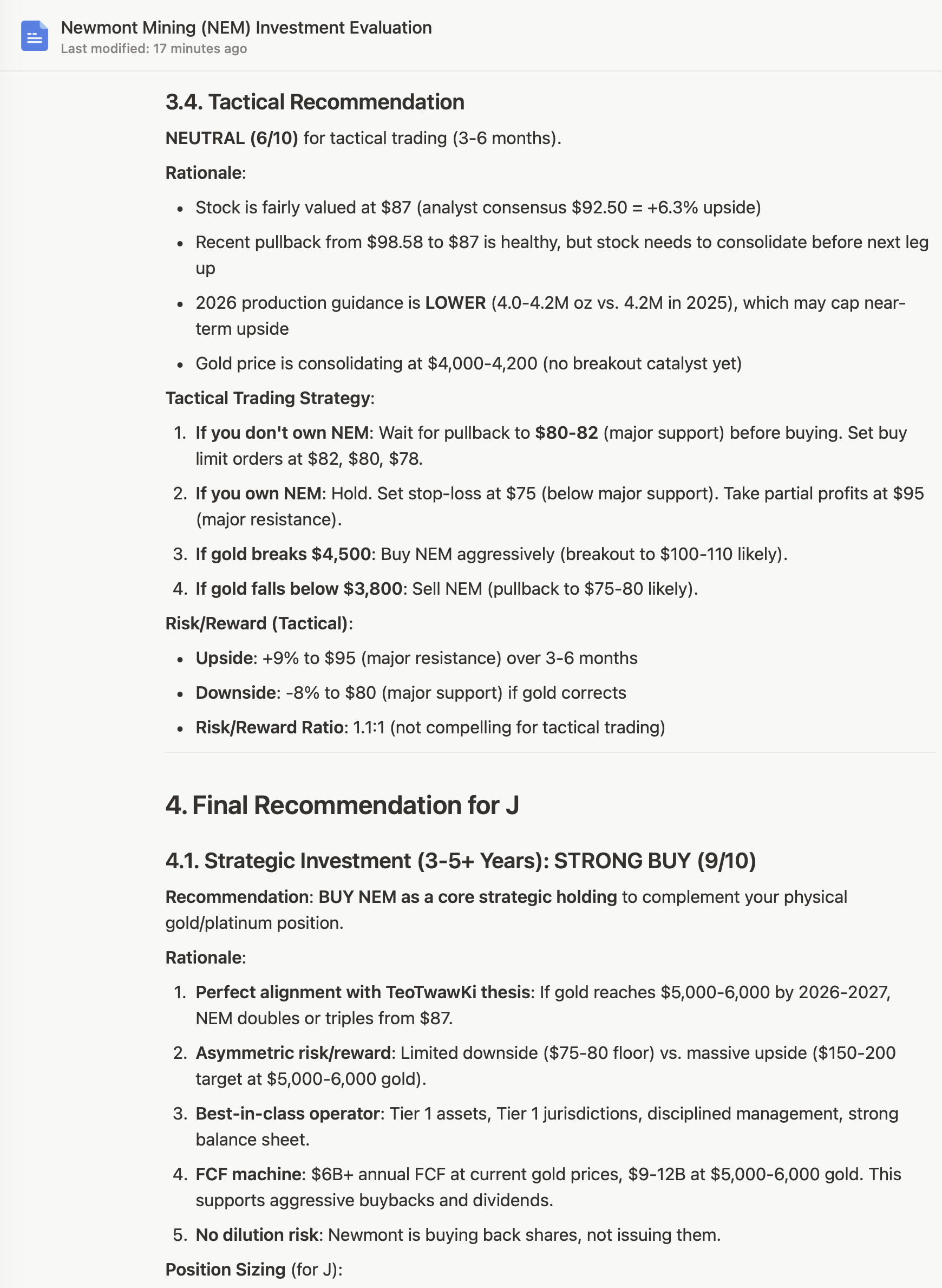 Strategic (3-5+ years): STRONG BUY (9/10). Newmont is the best-in-class gold miner with unmatched portfolio quality, disciplined management, and massive FCF generation. At $87 with gold at $4,155, NEM offers asymmetric upside if gold reaches $5,000-6,000 by 2026-2027 (doubles or triples). Perfect alignment with your TeoTwawKi thesis. Recommend 5-10% allocation (_redacted_) as satellite position to complement physical gold.