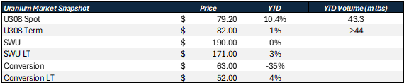 · The spot/term mix of U3O8,  Natural UF6 and enriched Uranium across spot and term contracts was not  disclosed, however total quantities were: