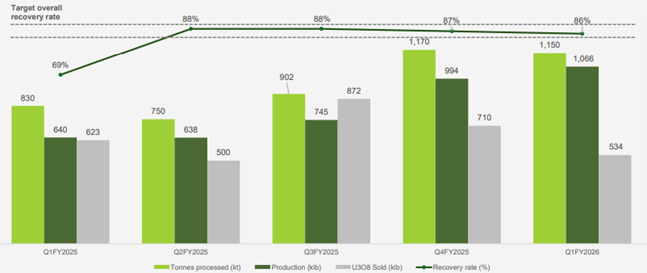 Langer  Heinrich Mine (LHM) has yielded a record quarterly production of 1.066m  lbs of U3O8 taking YTD production to 2.805m lbs. This output was  achieved by processing ore with a feed grade of approximately 0.0477%  U3O8, representative of the current operational blend, against a  life-of-mine reserve average of 0.0427%. This was supported by a 63%  increase in total material mined from Q1FY2025 with an 86% recovery  rate, and a strengthening financial position with $269.4 million in  cash. Current cost of production is US$41.6/lb, which is expected to  reduce as operations reach full capacity.