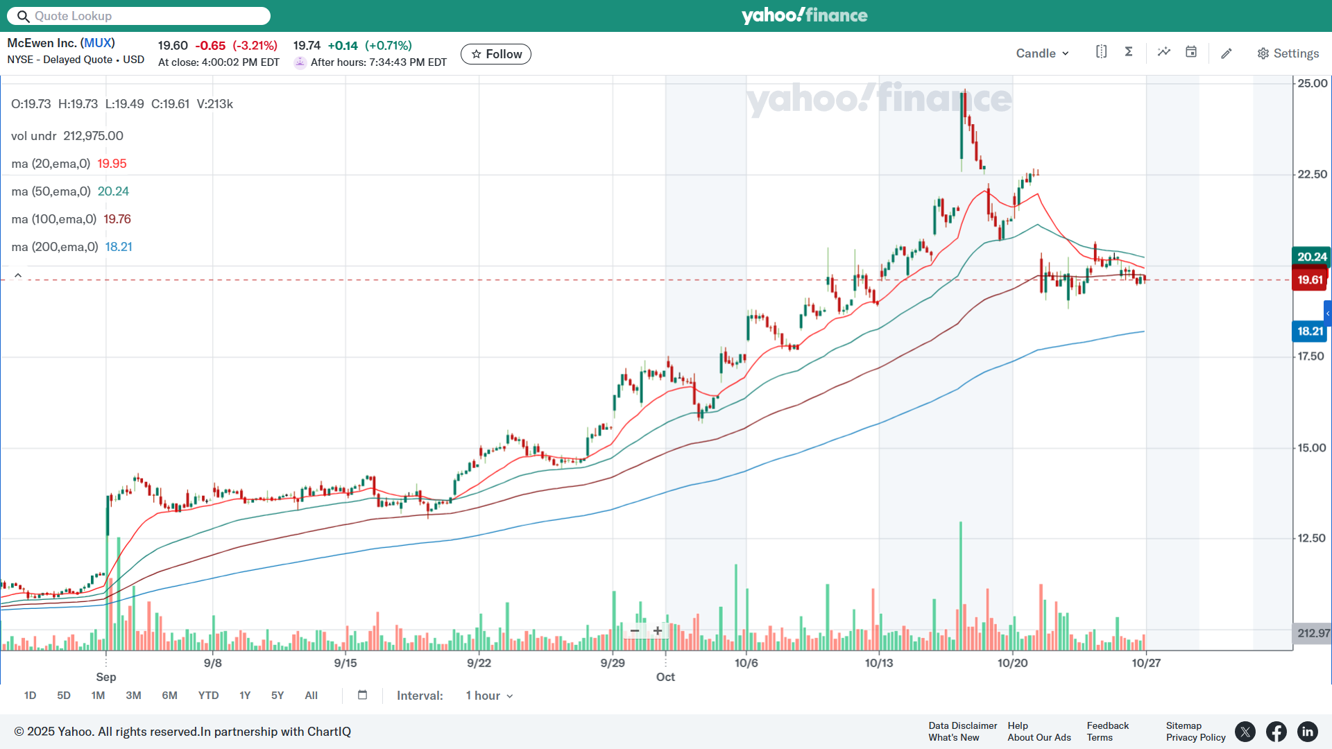 The 20-hour ema has dropped below the 50-hour, its been trending below the 100-hour since Tuesday, 10/21/25. This has not been a good week for most of the miners, its the first time MUX has fallen below the100-hour going back to when it gapped up back in early September.