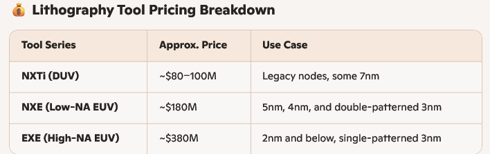 - EXE (High-NA EUV): ~$290M–$380M per unit