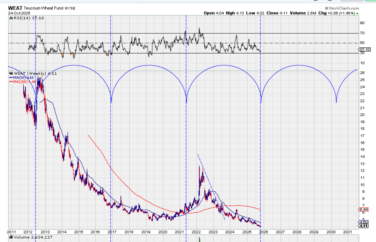 The cycles master says that Wheat exhibits an 18/9/4.5 yr cycle pattern. So I put an arbitrary 4.5 yr pattern here, possible bottom dead ahead. No position.