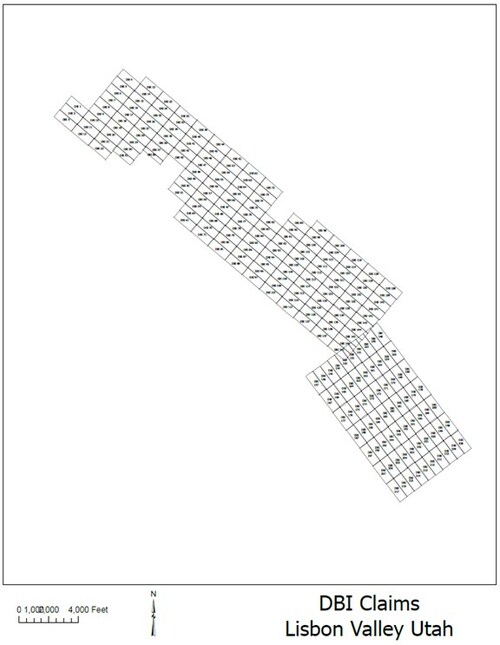 The Property consists of 217 claim blocks which covers the majority of the east side of the Lisbon Valley anticline, consolidating a contiguous claim block positioned along the prospective east belt. This footprint is shown on the DBI 1–217 claim map and aligns with the Company's thesis that salt anticlines commonly host mineral deposition on both flanks, not just the historically mined west belt. Conceptual targeting is further supported by cross-sectional block diagrams and oblique satellite imagery that highlight potential ore belts on the down-dropped eastern block and gamma-log anomalies in nearby wells.