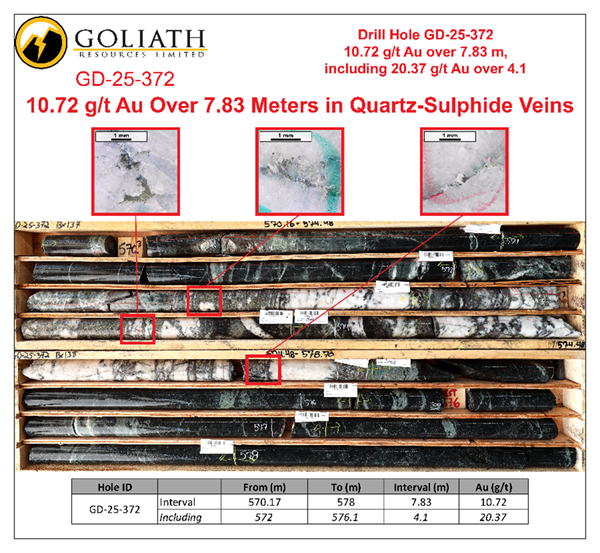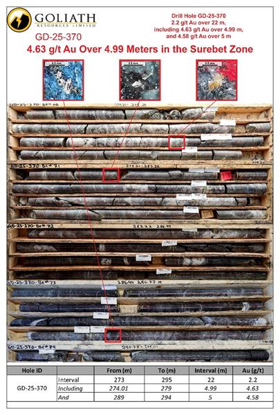 TORONTO, Oct. 27, 2025 (GLOBE NEWSWIRE) -- Goliath Resources Limited (TSX-V: GOT) (OTCQB: GOTRF) (FSE: B4IF) (the “Company” or “Goliath”) is pleased to announce additional assay results from its 2025 drill program where drill hole GD-25-372 intersected 10.72 g/t Au over 7.83 meters, including 20.37 g/t Au over 4.10 meters at the Surebet Discovery on its 100% controlled Golddigger Property (the “Property”), Golden Triangle, British Columbia.