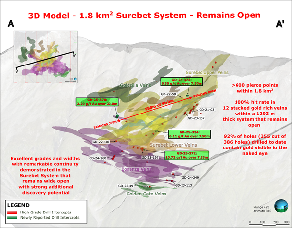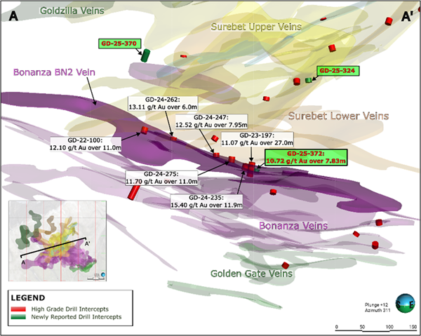 Drill hole GD-25-372 intersected 10.72 g/t Au over 7.83 meters including 20.37 g/t Au over 4.10 meters containing multiple occurrences of VG-NE within a zone of strong quartz-sulphide veining hosted in the andesite unit belonging to the Bonanza Zone. Drill hole GD-25-373 intersected 6.30 g/t Au over 7.50 meters, including 10.11 g/t Au over 4.67 meters, part of a zone of quartz-sulphide veining hosted in the sandstone unit corresponding to the Surebet Zone. Drill hole GD-25-324 intersected 6.11 g/t Au over 7.65 meters, including 8.04 g/t Au over 5.79 meters, from an interval corresponding to the Surebet Zone containing VG-NE in quartz-sulphide veins. Drill hole GD-25-370 intersected two broad intervals of gold mineralization that assayed 2.20 g/t Au over 22.00 meters, including 4.63 g/t Au over 4.99 meters and the second assayed 4.58 g/t Au over 5.00 meters from a zone of strong quartz-sulphide stockwork hosted in the andesite unit with multiple occurrences of VG-NE corresponding to the Bonanza Zone.