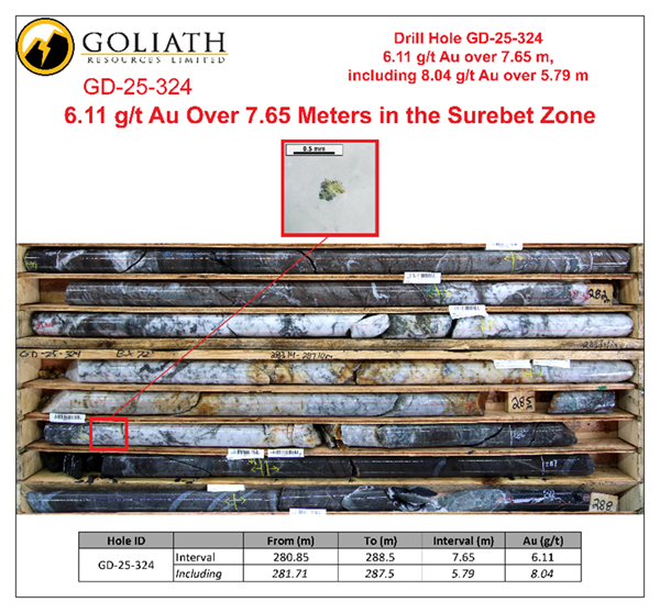- Drill hole GD-25-324 intersected 6.11 g/t Au over 7.65 meters, including 8.04 g/t Au over 5.79 meters, from an interval corresponding to the Surebet Zone, containing VG-NE in quartz-sulphide veins. The intercept is approximately true width, and these assays reflect gold only (AuEq value in the interval will be adjusted accordingly once Ag, Cu, Pb and Zn are received); see image below.