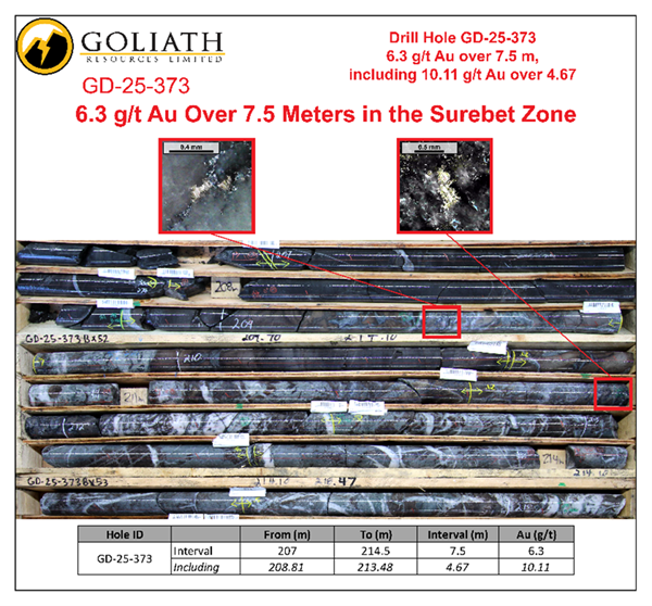 - Drill hole GD-25-373 intersected 6.30 g/t Au over 7.50 meters, including 10.11 g/t Au over 4.67 meters, part of a zone of quartz-sulphide veining hosted in the sandstone unit corresponding to the Surebet Zone that remains wide open. The intercept is approximately true width, and these assays reflect gold only (AuEq value in the interval will be adjusted accordingly once Ag, Cu, Pb and Zn are received); see image below.