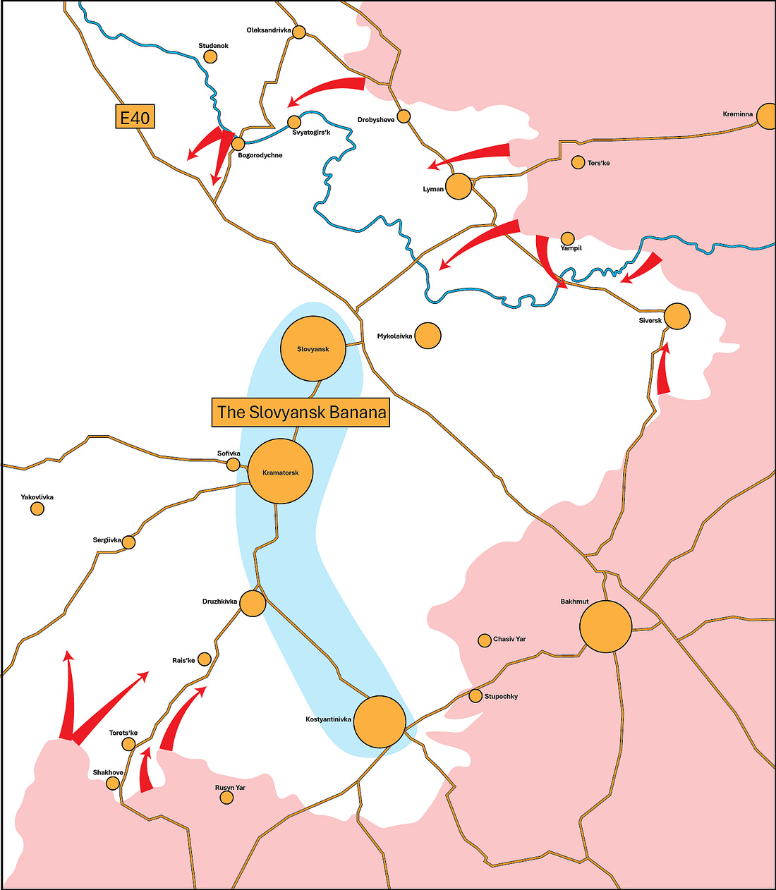 The second important fact about the Banana is that, despite its size, it is supported by just two highways which approach from the southwest and northwest respectively, funneling into the Banana like a wedge. Taking the northern highway/MSR (the E40 highway) as an example, we see that Russia’s operations inside the Donets bend are hardly secondary efforts: they are vital shaping operations linked to the integrity of the Banana. The E40 highway tracks the Donets bend very closely (it generally stays within five miles of the river. If the Russians sustain their progress north of the Donets and reach the river at Bogorodychne or Svyatogirsk, it will not only put E40 under persistent drone attack but also curl the defensive line behind the Banana, to say nothing of the enormous pressure on the Siversk salient.