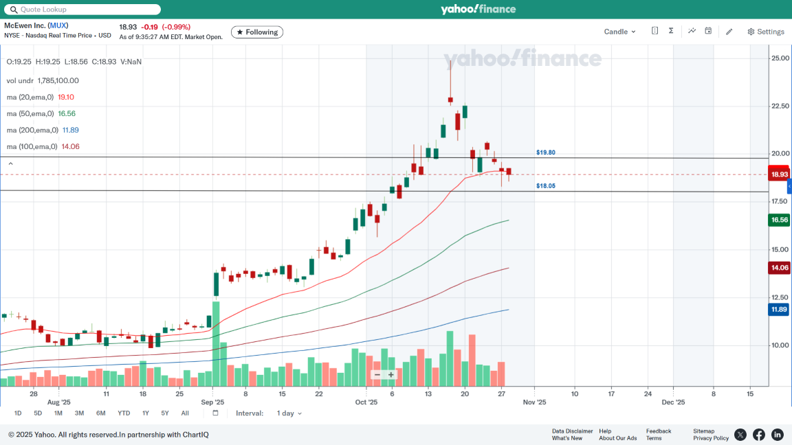 The lower pivot crosses over the red bar from 10/07/25 at $18.05, that's the next line to watch. MUX dropped below the 20-day-ema on Monday but managed to close just above it, "a very good move".