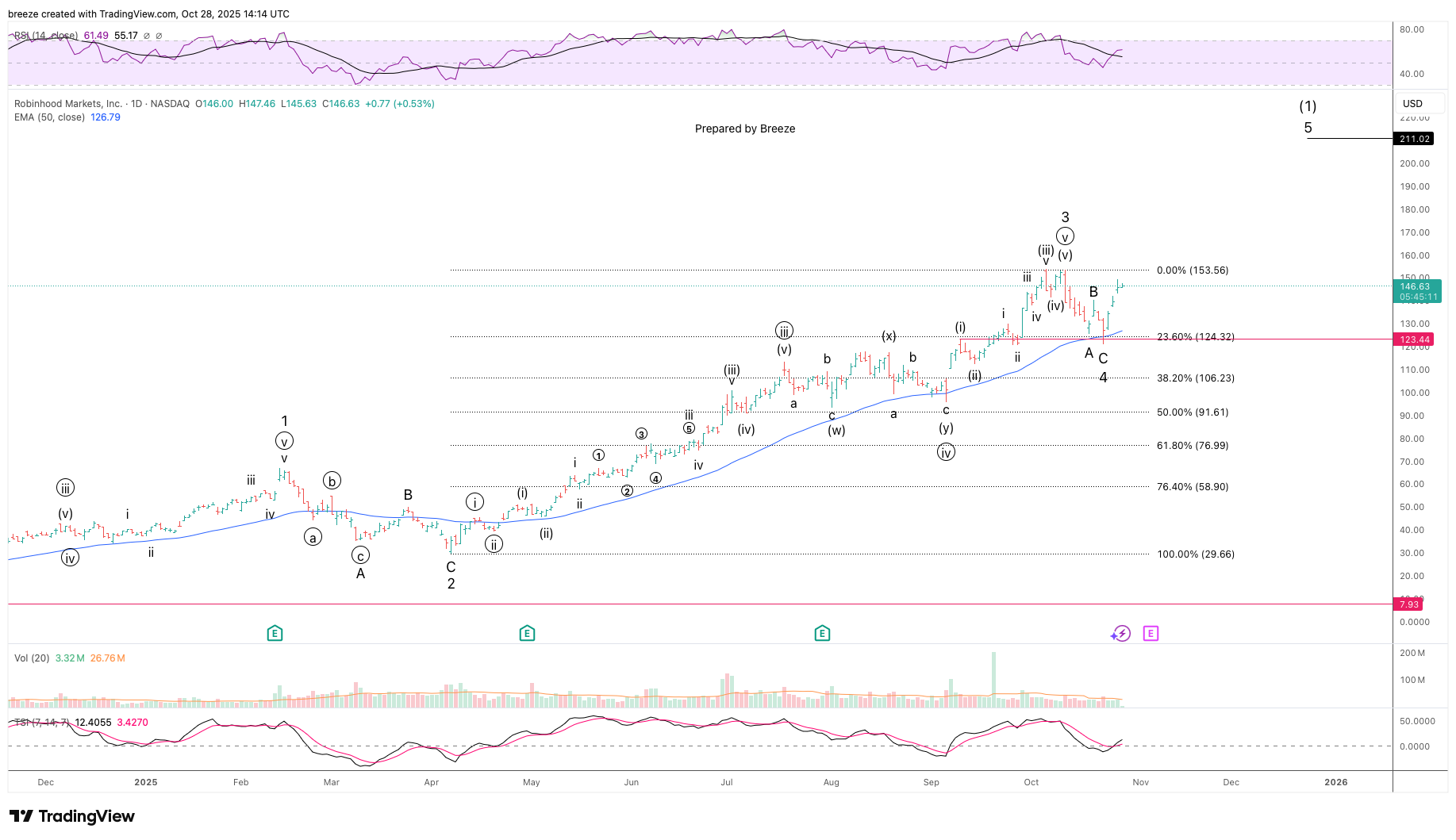 da_spot, here's a HOOD Wave Count Update. Minor Wave 4 appears complete. If so then Minor Wave 5 is in play with a target of 211. Breeze