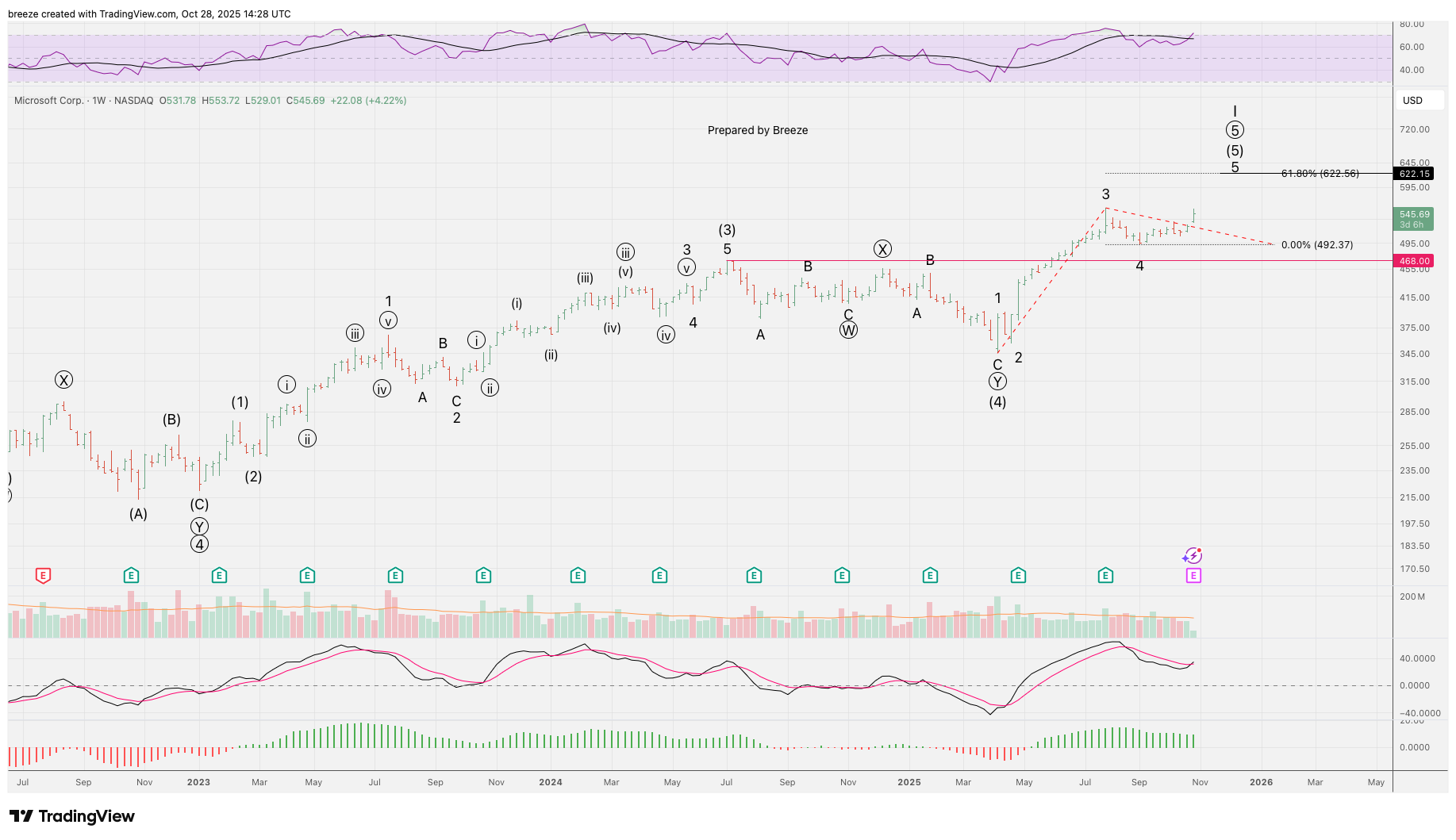 MSFT Wave Count Update. Minor Wave 5 of Intermediate Wave (5) is in play with a target of 622. Breeze