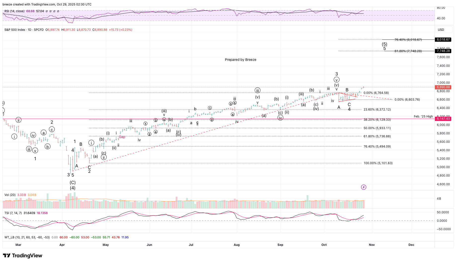 SPX Wave Count Update. Minor Wave 4 was a shallow pullback. Typically it retraces to the 38.2% level. It ended in a triangle. Minor Wave 5 of Intermediate Wave (5) is in play with a target of 7,748. But 8k is doable with an extended move. Breeze
