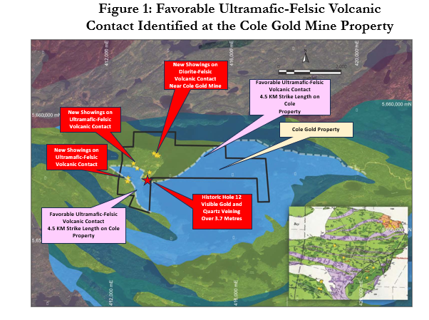 A historic drill hole (hole 12) completed on the Cole  property testing the ultramafic-felsic volcanic contact zone, yielded a  3.7 metre intercept containing visible gold in quartz-carbonate veining.  Diamond drilling is clearly warranted to further assess this target.