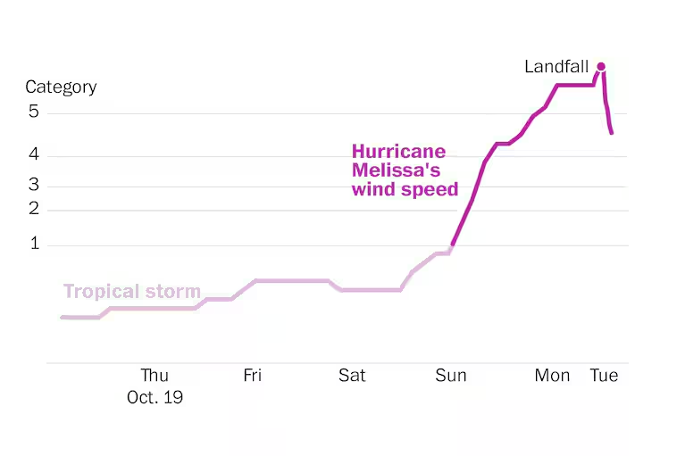 Melissa’s pathAfter moving away from Jamaica late Tuesday, Melissa briefly dipped to Category 3 intensity but became a formidable Category 4 storm within hours as it tapped into exceedingly warm ocean water, above 86 degrees, which is high-octane fuel for restrengthening. It then dropped to Category 3 just before making landfall in Cuba.