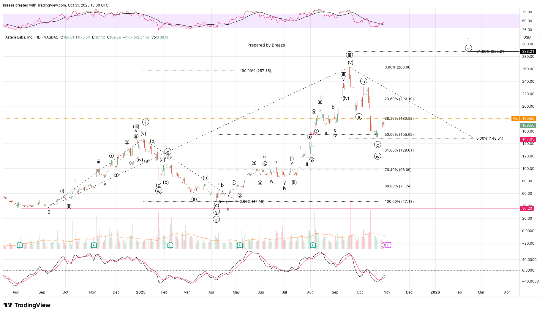 ALAB Wave Count Update. Minute Wave (circle) v is in play with a target of 288. Note Minute Wave (circle) iii ended at slightly above a 190% price extension (typically it's a 161.8%). Minute Wave (circle) iv did not overlap the Minute Wave (circle) i high. Breeze