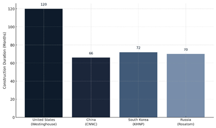The chart below compares average nuclear reactor construction durations among major reactor-exporting nations, highlighting the US (Westinghouse), China (CNNC), South Korea (KHNP), and Russia (Rosatom). It shows how the US faces longer build times, largely due to FOAK projects, regulatory complexity, and supply-chain reactivation, while China, Korea, and Russia complete similar projects in roughly 5–7 years. These faster schedules reflect standardised reactor designs, continuous domestic build programs, and mature supply chains, which make their companies globally competitive in the export market. As a result, CNNC, KHNP, and Rosatom currently dominate the international nuclear construction space, while Westinghouse is seeking to re-establish competitiveness.