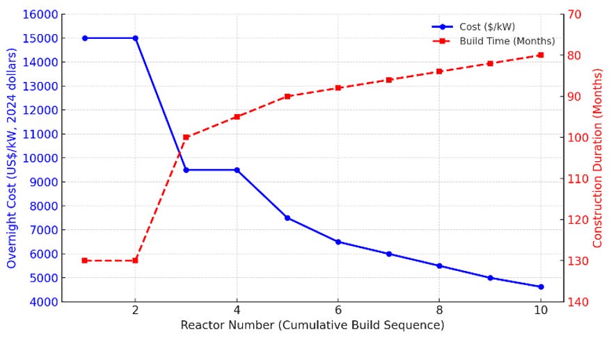 MIT’s analysis found that Vogtle 3 & 4’s first-of-a-kind AP1000 units cost about $15,000 per kW in 2024 dollars due to design changes, supply-chain issues, and long schedules. The study projects that the next pair could fall to $8,300–10,375 per kW, and an Nth-of-a-kind fleet to roughly $4,625 per kW, as standardization and experience improve efficiency. Overall, this suggests that building around ten AP1000s in sequence could halve capital costs, shorten construction to 80–96 months, and deliver electricity at $66–97 per MWh, depending on financing and policy support