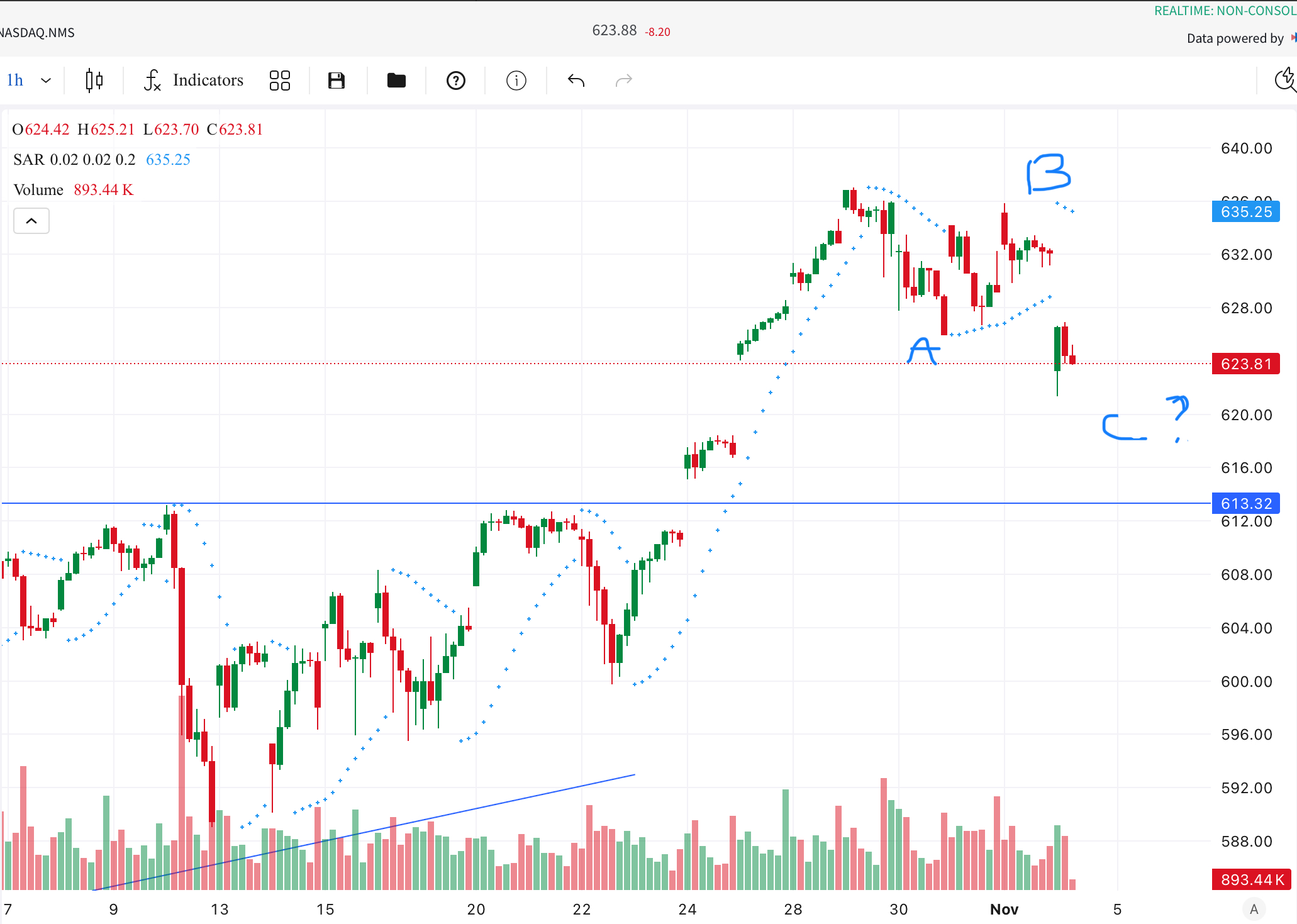 On this hourly chart of QQQ, looking from the top, you can see a small five-waver down (A) then three waves up - and right now, we may be in the wave 4 of C (or 3).