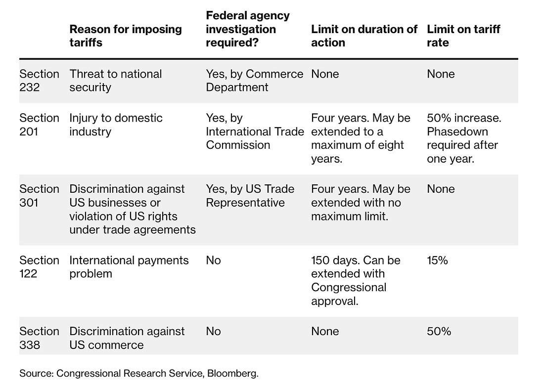 There are a number of such avenues. U.S. trade law gives presidents considerable discretion to impose tariffs without Congressional approval. Why? Because there are times when the economic or political pressure to deviate from existing tariffs is overwhelming — for example, when a flood of motorcycle imports from Japan threatened to put Harley-Davidson, an American icon, out of business. So the law provides for “pressure release valves” that can give industries time to adjust and tempers time to cool. Bloomberg has a good summary of the options: