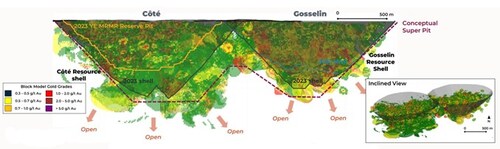 Figure 1: Long section of Côté and Gosselin conceptual super pit (Source: IAMGOLD Q3 2025 Presentation) (CNW Group/Metalla Royalty & Streaming Ltd.)
