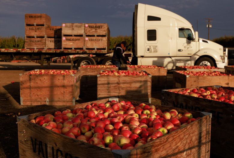 Freshly picked apples are ready to be transported at Ric Valicoff’s apple farm in Wapato. Farmers throughout the Yakima River basin, especially the Roza Irrigation District, have faced the third... (Erika Schultz / The Seattle Times)