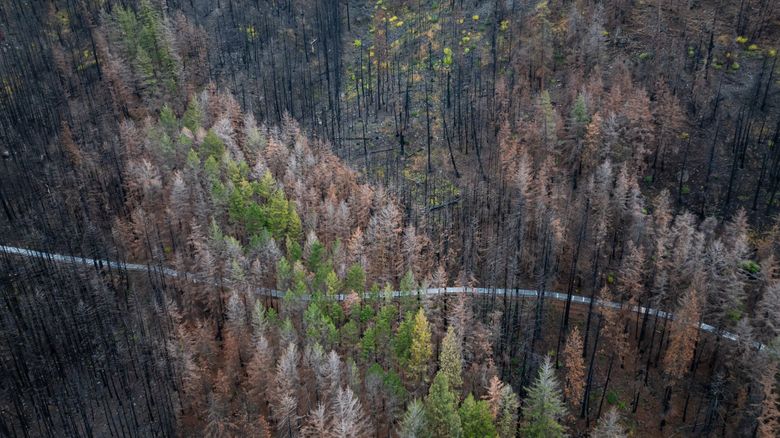 This option is more affordable than losing entire crops and replacing the canal under duress, Okelberry said. It’s a large expense, but it’s necessary to safeguard the region’s vital industry and food supply. Trees scorched by last year’s Retreat fire fill the hillside next to the Yakima-Tieton Irrigation District’s 115-year-old main… (Erika Schultz / The Seattle Times)