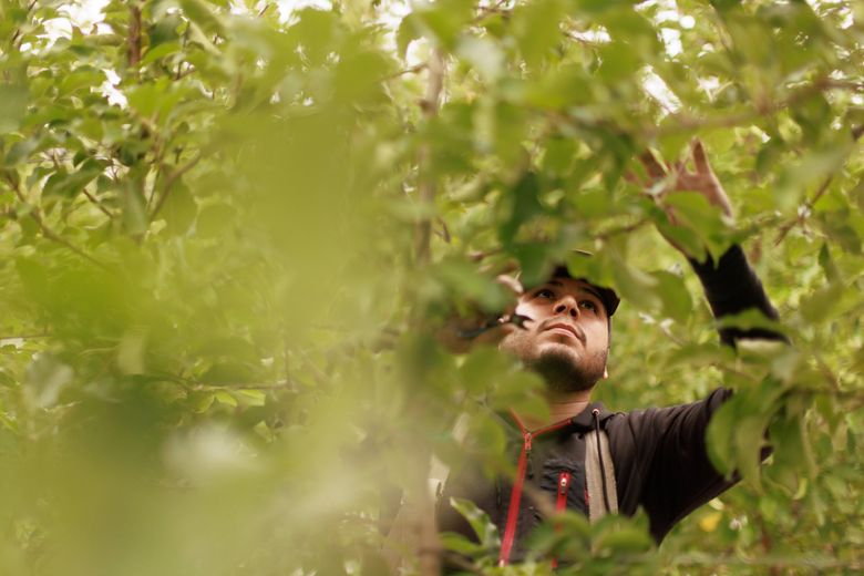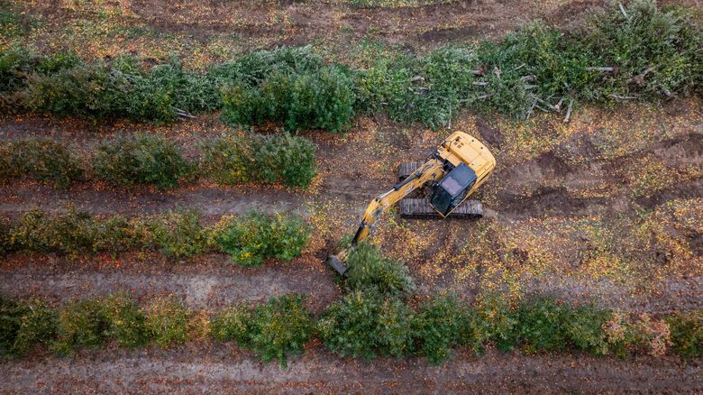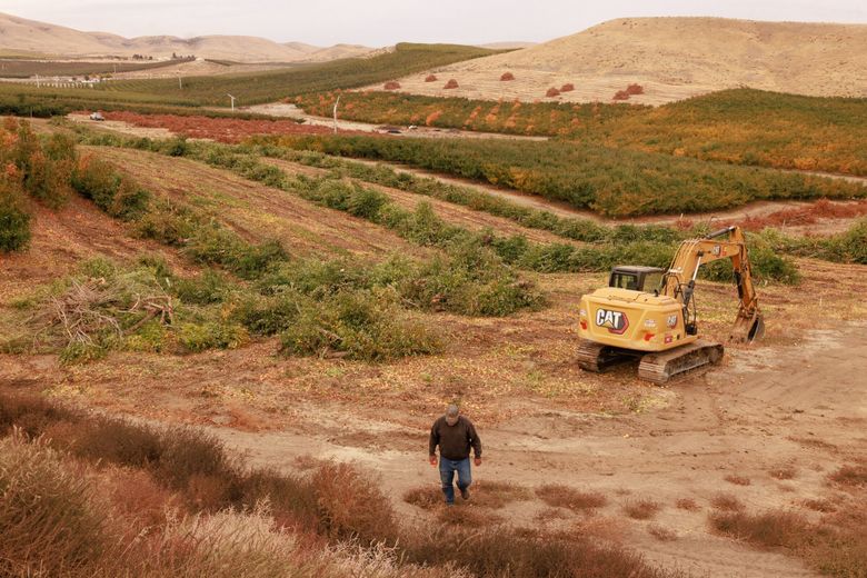 The operator collects the trees in piles where they’ll be burned. Valicoff stands stoic and watches. He and his brother, Rob, own more than 1,400 acres. They grow apples, apricots, peaches, pears and more. So far this year, they’ve torn out about 110 acres of apple trees, and dozens more will follow.