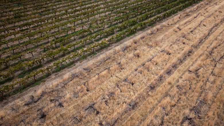 Due to drought, farmer Jim Willard tore out 5 acres of riesling plants last year. He’ll soon tear out another 7 acres of malbec plants, having to make tough decisions on allocating water. The green plants are riesling grapes for which Willard still has a winemaker ready to buy. (Erika Schultz / The Seattle Times)