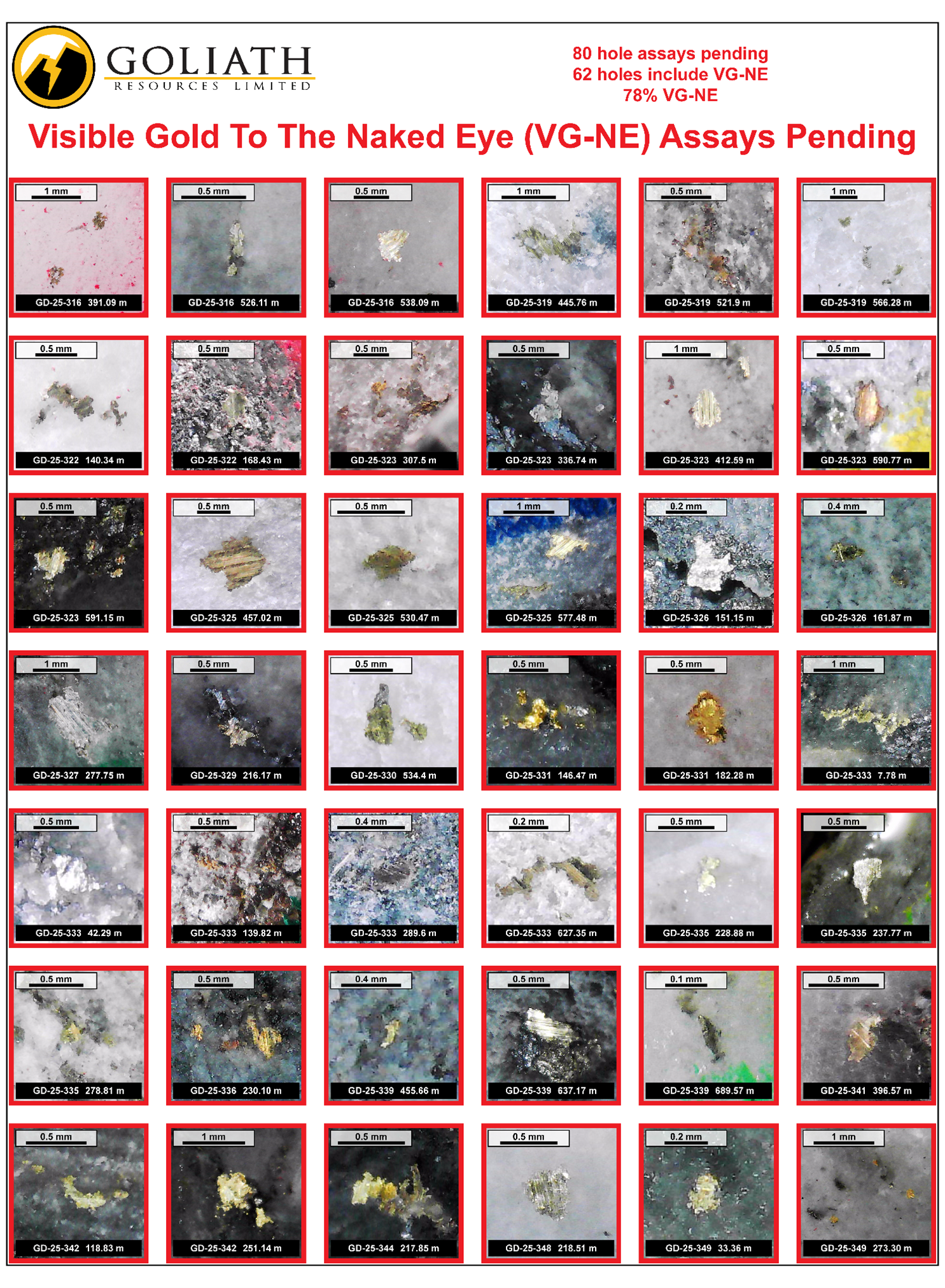 - 60 out of 64 holes (or 94%) drilled in 2024 contain VG-NE up to 11.5 mm (7/16 inches) in size, all of which returned high-grade gold. See news releases dated: July 7, 2025, June 23, 2025, January 7, 2025, January 13, 2025, February 10, 2025, February 18, 2025, February 27, 2025, December 12, 2024 and July 30, 2024.