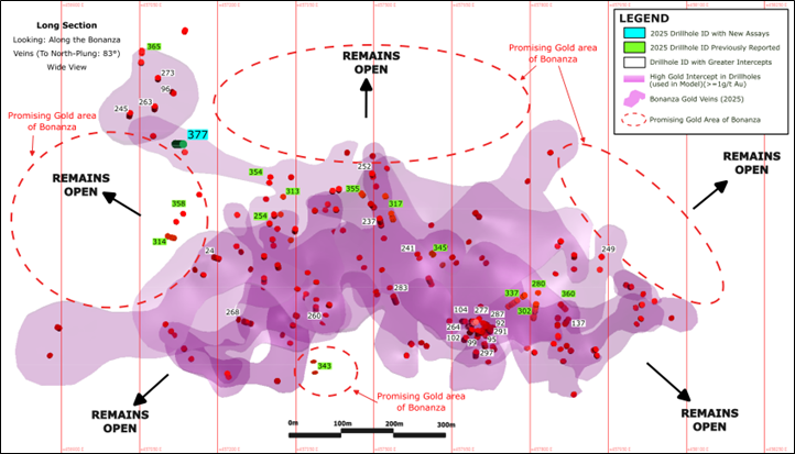 - Drill hole GD-25-377 intersected three separate intervals. The first being 10.25 g/t Au over 7.02 meters, within 7.16 g/t Au over 10.84 meters, within 5.20 g/t Au over 15.00 meters containing multiple occurrences of VG-NE within a zone of strong quartz-sulphide veining hosted in the Bonanza Zone that remains open. The second intercept is a broad interval of the Bonanza Zone that remains open and assayed 1.06 g/t Au over 30.00 meters, including 1.45 g/t Au over 20.04 meters, including 2.34 g/t Au over 9.01 meters, as well as an interval that assayed 8.73 g/t Au over 3.80 meters. The intercepts are approximately true width, and these assays reflect gold only (AuEq value in the interval will be adjusted accordingly once Ag, Cu, Pb and Zn are received); see image below.