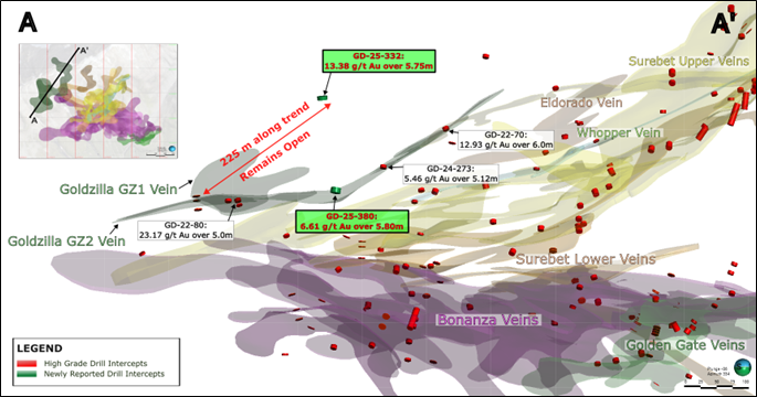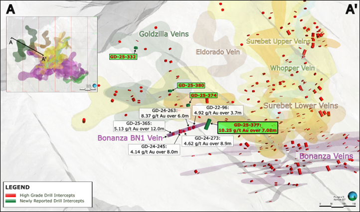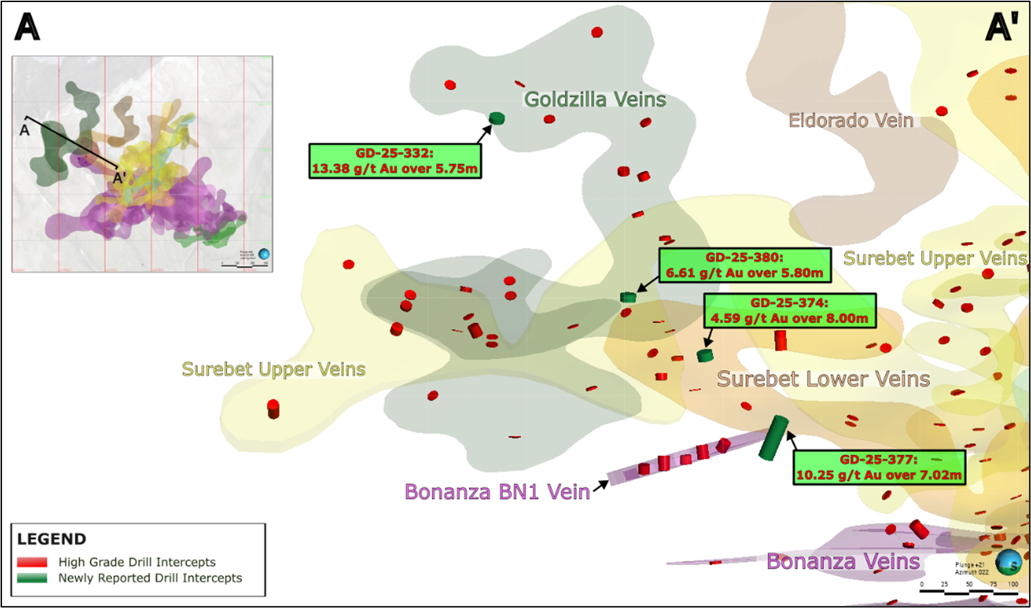 Drill hole GD-25-377 intersected three separate intervals. The first assayed 10.25 g/t Au over 7.02 meters, within 7.16 g/t Au over 10.84 meters, within 5.20 g/t Au over 15.00 meters containing multiple occurrences of VG-NE within a zone of strong quartz-sulphide veining hosted in the Bonanza Zone that remains open. The second intersected a broad interval of the Bonanza Zone that remains open and assayed 1.06 g/t Au over 30.00 meters, including 1.45 g/t Au over 20.04 meters, including 2.34 g/t Au over 9.01 meters, as well as a third interval that assayed 8.73 g/t Au over 3.80 meters. Drill hole GD-25-332 intersected 13.38 g/t Au over 5.75 meters, including 15.83 g/t Au over 4.86 meters, including 19.87 g/t Au over 3.87 meters part of a zone of quartz-sulphide veining containing multiple occurrences of VG-NE hosted in in the Goldzilla Vein that remains open. Drill hole GD-25-380 intersected 6.61 g/t Au over 5.80 meters, within 4.83 g/t Au over 8.00 meters from an interval corresponding to the Goldzilla Vein containing VG-NE in quartz-sulphide veins. Drill hole GD-25-374 intersected 4.59 g/t Au over 8.00 meters, including 5.21 g/t Au over 7.00 meters, including 8.89 g/t Au over 3.00 meters from a zone of strong quartz-sulphide stockwork part of the Surebet Zone containing multiple occurrences of VG-NE.