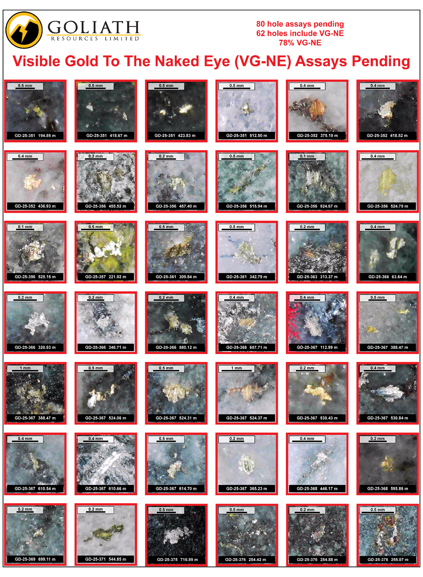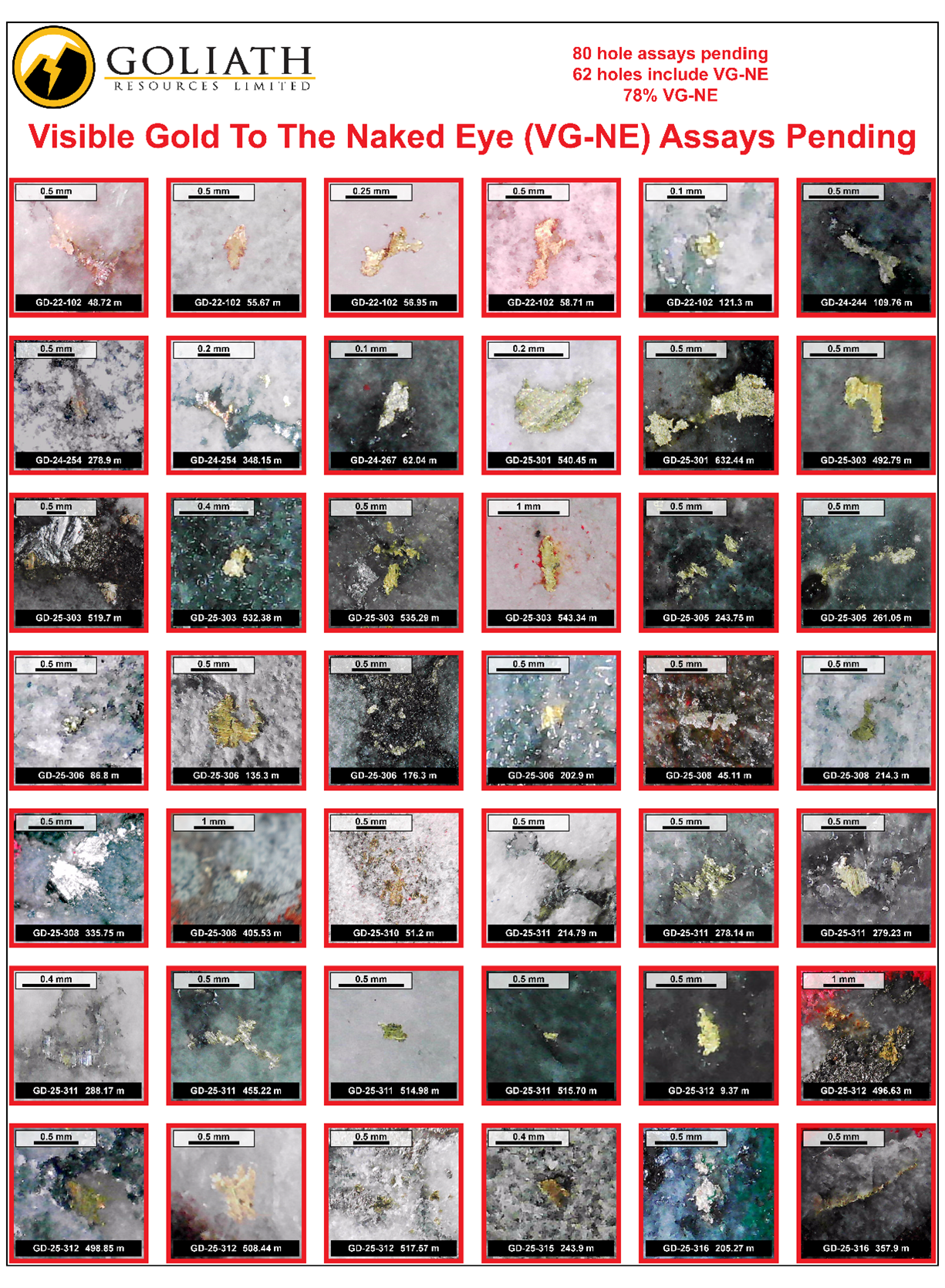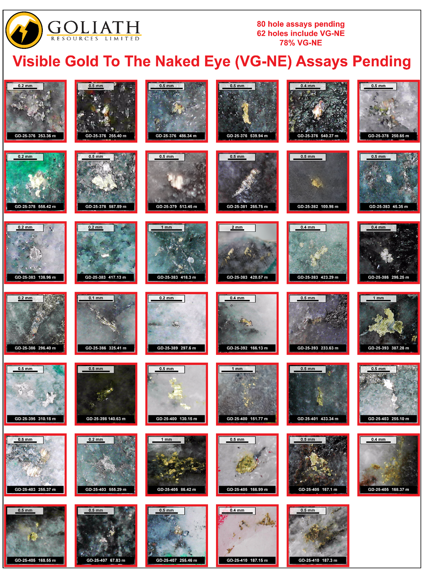 - 83 out of 110 holes (or 76%) drilled in 2025 contain VG-NE and 100% of drill holes have intersected substantial quartz-sulphide mineralization. Assays are still pending for 80 holes from this year’s exploration campaign, of which 62 (representing 78% of the total pending) contain visible gold to the naked eye (VG-NE). See news releases dated: October 27, 2025, September 22, 2025, September 8, 2025, August 26, 2025, and July 28, 2025.