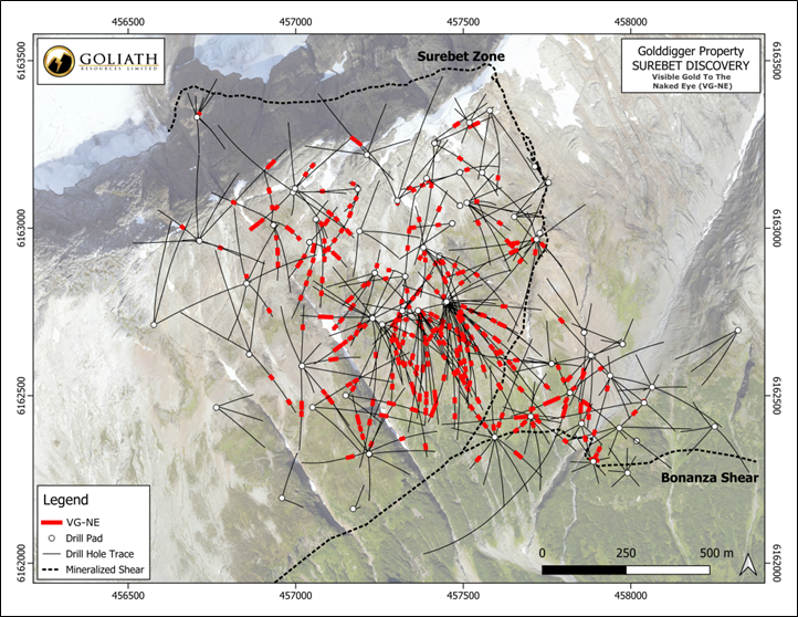 Mr. Roger Rosmus, Founder & CEO of Goliath states: “The Surebet high-grade gold discovery continues to consistently deliver good assay results, which clearly shows continuity and predictability. Particularly noted by the vast distribution of VG-NE in drill holes spanning an area for over 1,200 metres from northwest to southeast, over 1,000 meters from northeast to southwest and over 800 meters of vertical relief. Within that area are a series of gently dipping stacked veins that dip to the southwest, and another series of gently dipping stacked veins that dip to the southeast. They remain open in the down dip direction of both, suggesting that both could have separate sources feeding each series of stacked veins that would be over 4,000 metres apart. Or one magmatic event that is feeding from either side of it. Equally as impressive are the vertical RIRG dykes coming up through stacked veins, which suggests that there is a magma chamber below the entire mineralized area. At the intersections of the gently dipping veins and the vertical RIRG dykes (called Goldilocks zones) there are two temperature regimes for the VG-NE enriching the zones. Plus, we have found VG-NE within a third rock package with minimal drilling into those zones. Collectively, it is apparent that we are nowhere near the limits of the system, in fact, there is a good chance that we may only be halfway down the various zones with plenty more room to grow the system. Our team looks forward to receiving the assays from remaining holes so we can update the 3D model.”