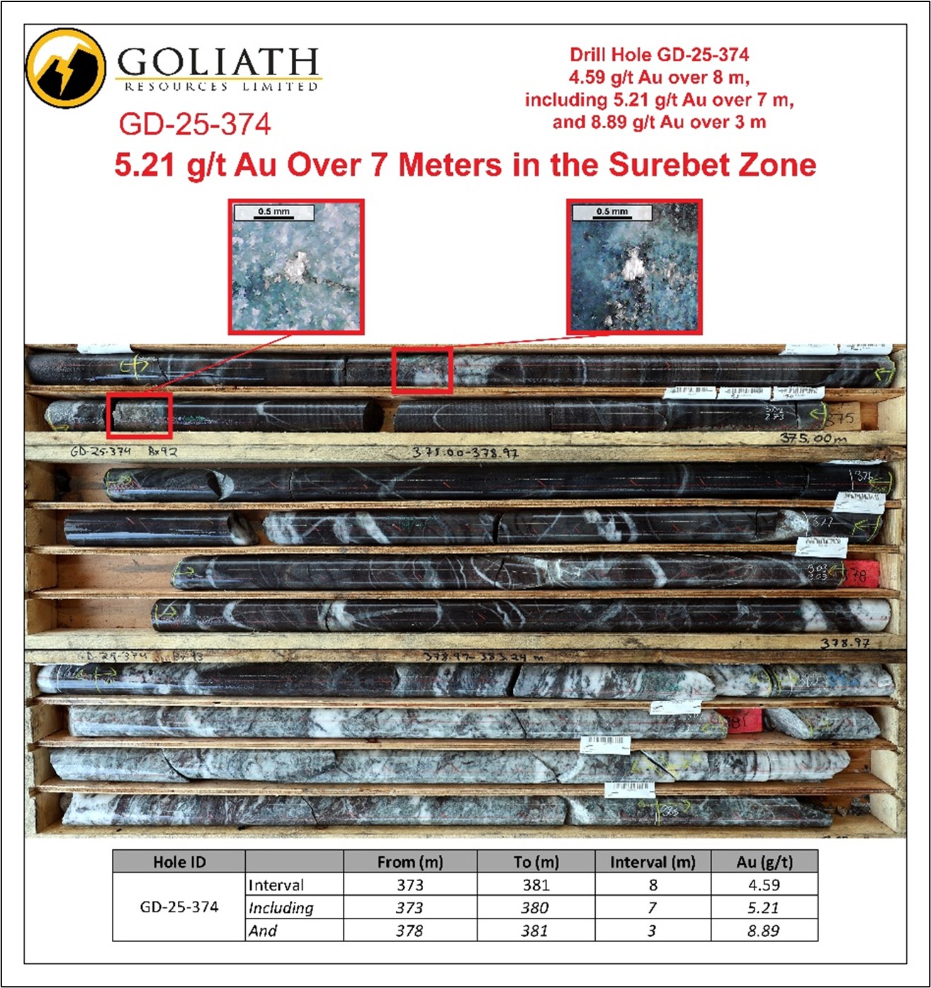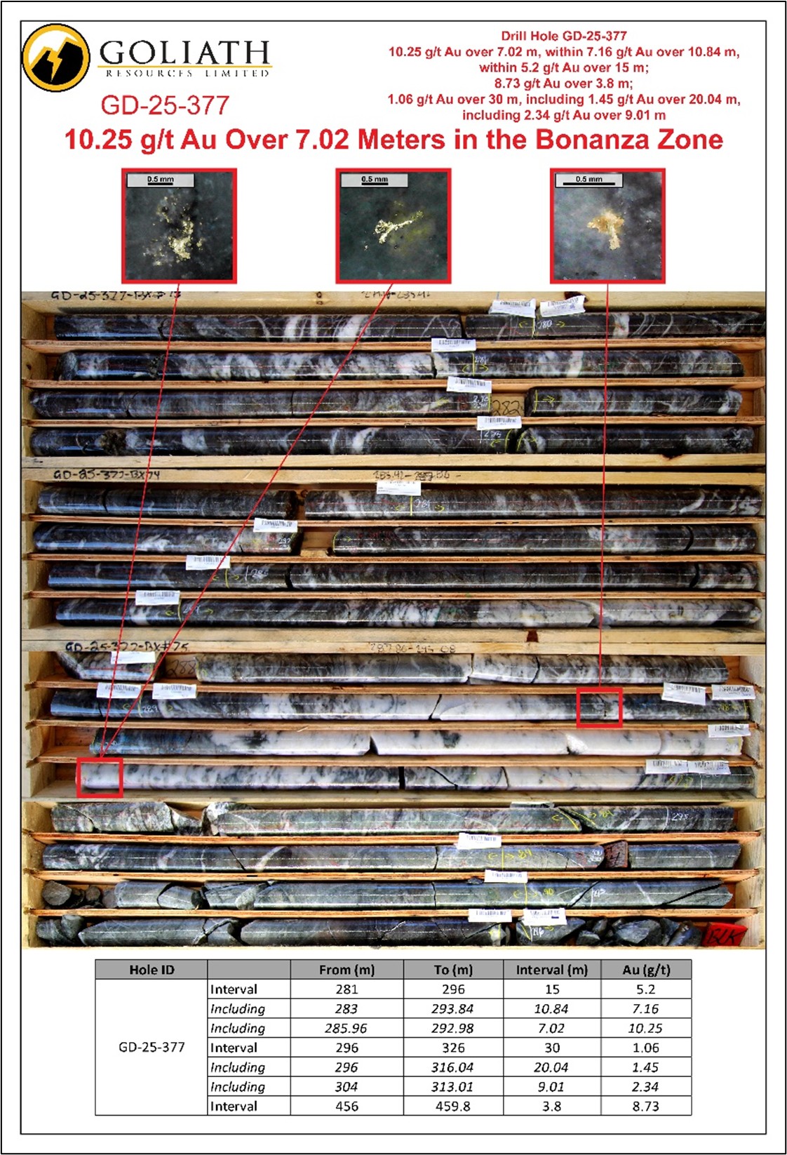 TORONTO, Nov. 17, 2025 (GLOBE NEWSWIRE) -- Goliath Resources Limited (TSX-V: GOT) (OTCQB: GOTRF) (FSE: B4IF) (the “Company” or “Goliath”) is pleased to announce additional assay results from its 2025 drill program where drill hole GD-25-377 intersected three separate mineralized intervals up to 10.25 g/t Au over 7.02 meters, within 7.16 g/t Au over 10.84 meters, within 5.20 g/t Au over 15.00 meters containing multiple occurrences of VG-NE within a zone of strong quartz-sulphide veining hosted in the Bonanza Zone that remains open at the Surebet Discovery on its 100% controlled Golddigger Property (the “Property”), Golden Triangle, British Columbia. Assay results from the Surebet Discovery continue to confirm desirable widths and grades with consistent continuity. These results have extended the high-grade core by 80 meters to the NW for a total of 580 meters and remains open. Remaining drill results from the 2025 drill season have strong potential to continue to provide desirable widths and grades and continuity as observed thus far.