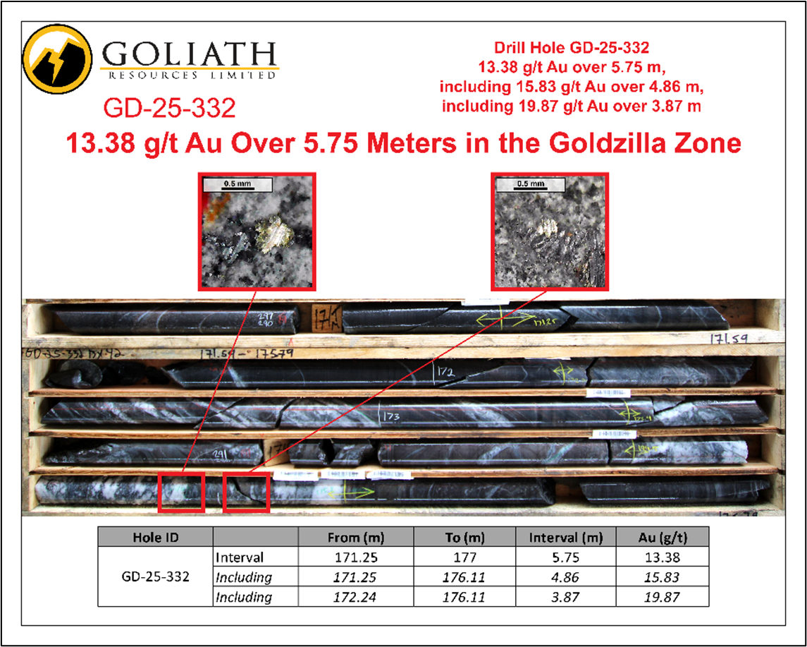 - Drill hole GD-25-332 intersected 13.38 g/t Au over 5.75 meters, including 15.83 g/t Au over 4.86 meters, including 19.87 g/t Au over 3.87 meters part of a zone of quartz-sulphide veining containing multiple occurrences of VG-NE hosted in in the Goldzilla Vein that remains open. The intercept is approximately true width, and these assays reflect gold only (AuEq value in the interval will be adjusted accordingly once Ag, Cu, Pb and Zn are received); see image below.