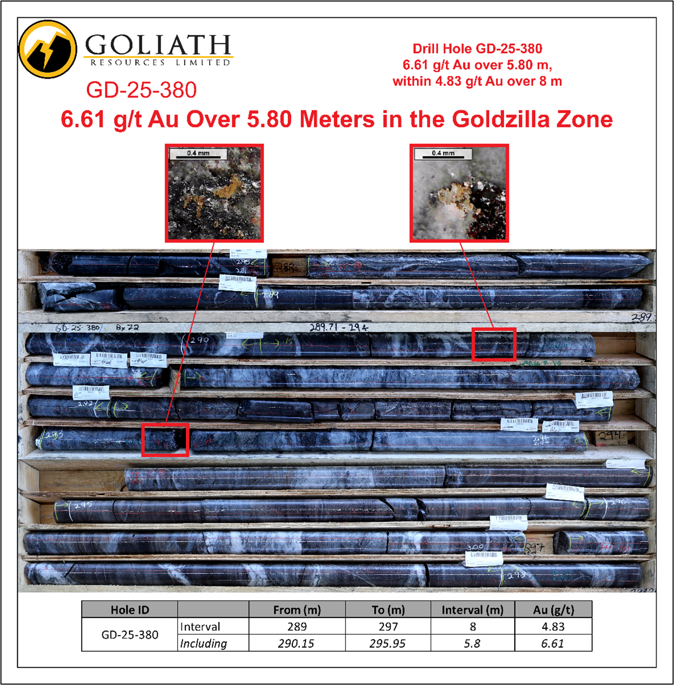 - Drill hole GD-25-380 intersected 6.61 g/t Au over 5.80 meters, within 4.83 g/t Au over 8.00 meters from an interval corresponding to the Goldzilla Vein containing VG-NE in quartz-sulphide veins. The intercept is approximately true width, and these assays reflect gold only (AuEq value in the interval will be adjusted accordingly once Ag, Cu, Pb and Zn are received); see image below.