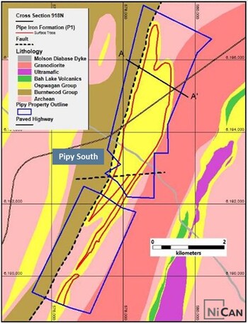 Figure 4: Interpreted Geological Section (A-A’) of the Pipy South Property (CNW Group/Nican Ltd.)