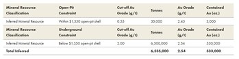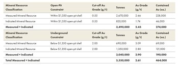 Measured + Indicated (US$ 1350): 464,000 oz @ 2.61 g/t Au, 5.5 M tonnes Inferred (US$ 1350): 530,000 oz @ 2.54 g/t Au, 6.5 M tonnes See table 1 & 2, January 17, 2017