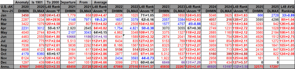 Totals are record reports for the entire United States including all territories minus those from Alaska. I’ve subtracted those from Alaska to get a better representation of what has occurred across the lower 48 states in association with lower 48 state rankings.
